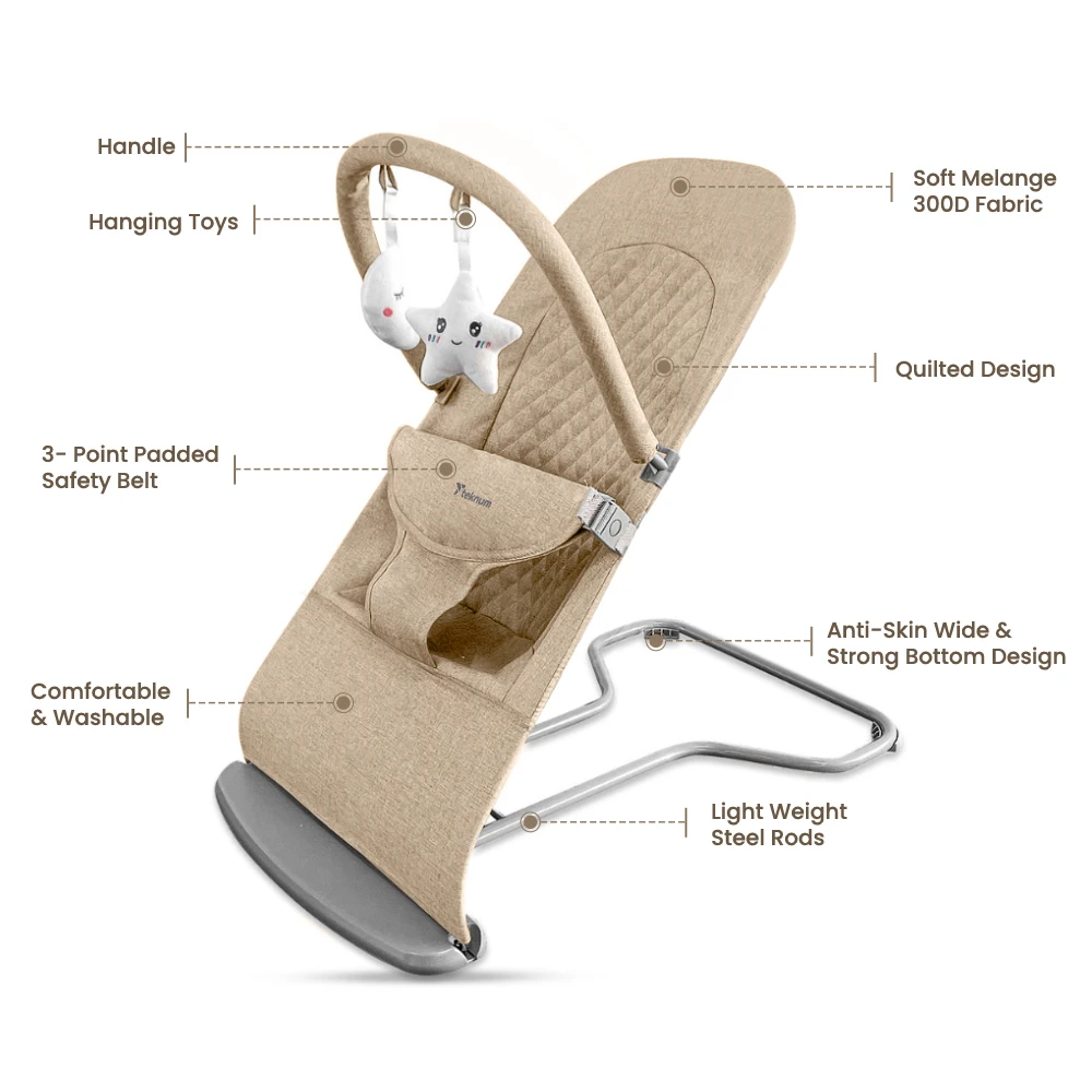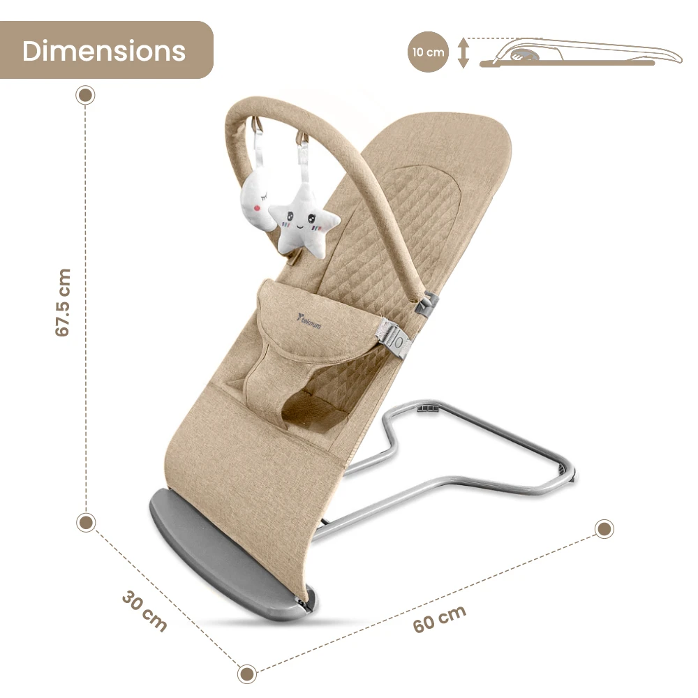 The Teknum 3‑Stage Baby Bouncer/Recliner Seat in ivory combines gentle functionality with a soothing aesthetic. This versatile seat offers three recline positions—perfect for bouncing, relaxing, or upright support—adaptable to various moments throughout the day. The sturdy yet lightweight frame pairs with plush, quilted fabric that offers gentle comfort. A three-point padded safety belt ensures secure seating, while included hanging toys support early sensory engagement and coordination. A single-button fold system enables fast and compact storage, and the anti-skid bottom provides stability on smooth surfaces. The removable fabric cover is machine-washable for quick maintenance. This bouncer seat blends ease of use with thoughtful design, making it a practical companion for daily routines or a thoughtful gift idea.