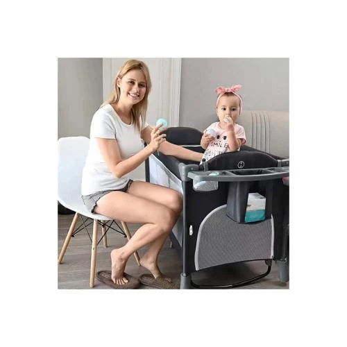 The Teknum 4-in-1 Baby Bedside Co-Sleeper Bassinet and Playpen by SAMBOX is a versatile and complete baby care solution for new parents, combining a co-sleeper, playpen, rocker, and diaper changing station all in one. Designed to securely attach to moms bed with included hooks and belts, it ensures your newborn sleeps safely close by for easy nighttime feeding and comfort. Featuring a detachable rocker for soothing naps, a removable second-floor bassinet mattress, and a spacious playpen with a zipper-enclosed entrance for toddler playtime. The built-in changing station includes elevated borders and safety belts to keep baby secure while diapering, with an organizer for nappies, wipes, and toys. Brightly colored musical rotating toys stimulate sensory and motor skill development, while a 360° mosquito net protects your little one from insects. Made with durable 210D Oxford fabric, steel tubes, and soft sponge padding, this foldable cot has wheels for easy mobility and folds compactly into a carry bag-perfect for travel or home use. Suitable from birth up to 3 years old, with a load capacity of up to 30 kg, its a practical, stylish, and essential addition to any nursery.