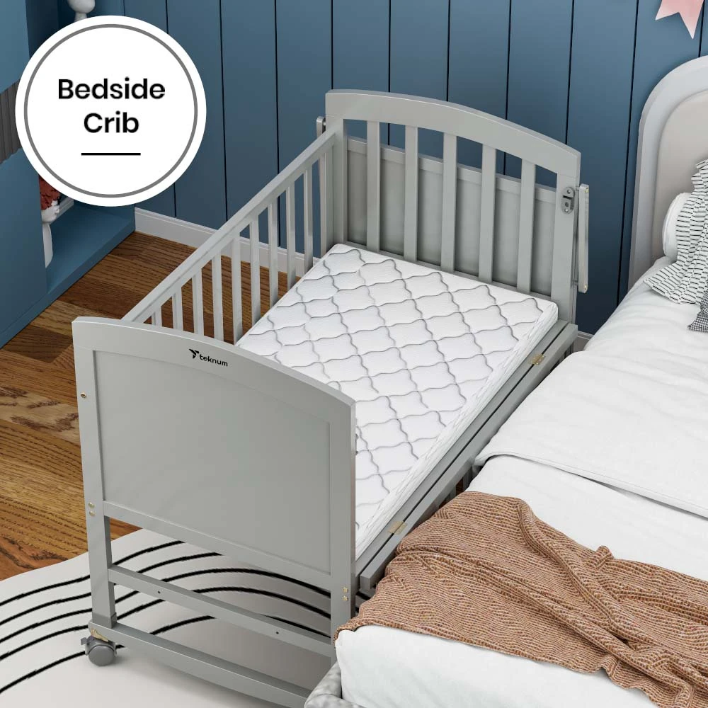 convertible kids bed, bedside crib, multifunction baby bed, teknum bed, grey kids furniture, crib with mattress, baby sleeping solution, mosquito net crib, detachable wheels bed, rolling baby bed, study desk for kids, space saving crib, adjustable kids bed, baby nursery furniture, co-sleeper bed, practical baby gear, safe sleeping crib, versatile baby furniture, portable crib, modern baby bed