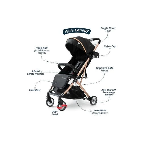 The Teknum Explorer Travel Stroller Combo in Black by SAMBOX is the perfect choice for modern, on-the-go parents looking for lightweight functionality with premium design. This air cabin-friendly stroller features a sleek gold aluminum frame and folds/unfolds effortlessly in just one second using its single-hand folding system. Weighing only 5.5kg, it includes a unique push trolley handle that allows for easy rolling while traveling. Designed for comfort, the stroller offers a spacious seat, adjustable footrest, and a multi-position recline from 95° to 180°, ideal for both seated and napping positions. The net-like peek-a-boo window ensures proper ventilation and adult supervision, while the mosquito net, silent 360° swivel wheels with shock absorption, and adjustable canopy protect your baby in every weather condition. The combo includes the stylish Sunveno Diaper Bag with golden zipper detailing and wide top access, offering ample storage with a luxe look. Strong stroller hooks complete the travel-ready set, making this combo ideal for babies aged 6 to 36 months, with a weight capacity of up to 15kg.