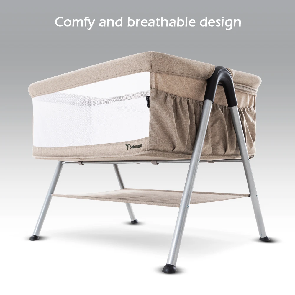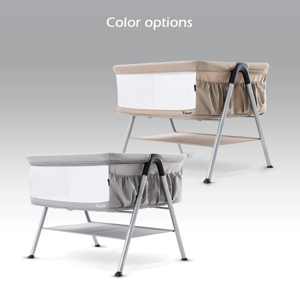The Teknum FELLOW 2 Twin Bedside Crib Bassinet in ivory offers gentle elegance and functional design for newborn twins. Designed to sit securely alongside your bed, it supports effortless access during nighttime feeds. Dual-side breathable mesh fabric ensures proper airflow and visibility, while the included mattress accommodates both babies comfortably. A handy under-bed storage basket keeps essentials organized and within reach. With its refined ivory finish and modern styling, this bassinet blends seamlessly into nursery décor without sacrificing safety or comfort.