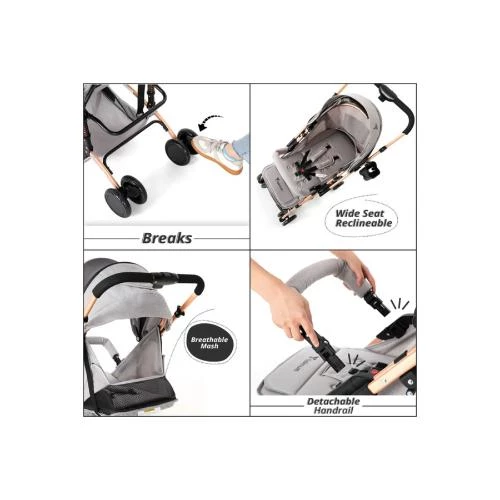 The Teknum Reversible Trip Stroller in sleek grey combines ultimate convenience and comfort for both baby and parent with its reversible seat allowing baby-facing-mom or forward-facing positions. Featuring excellent shock absorbers and a 360° swivel front wheel with locking system, this stroller ensures a smooth and shockproof ride. The extra-wide canopy and spacious seat, equipped with a 5-point safety harness and handrail, provide maximum security and comfort for babies aged 6 to 36 months, supporting up to 15 kg. Crafted with a sturdy steel gold frame, linen canopy and bassinet, EVA wheels, and Oxford fabric basket, it boasts a coffee cup holder, large shopping basket, and handy features like hand brake, wheel brake, and easy one-button folding for compact storage and portability. Included is the stylish Ace diaper bag that converts between handbag and backpack styles, making it the perfect companion for busy parents on the move. This all-in-one stroller and bag set is thoughtfully designed for safety, style, and practicality.