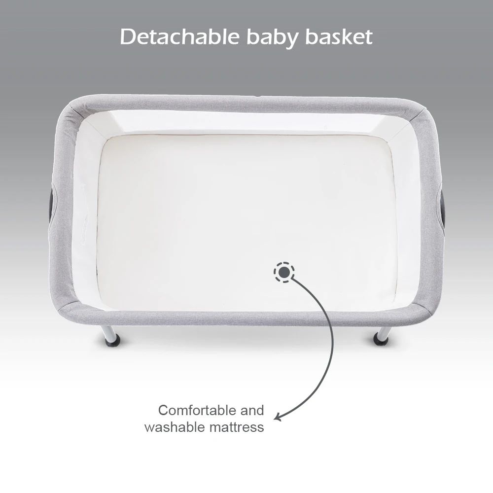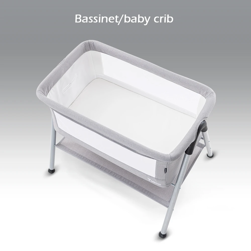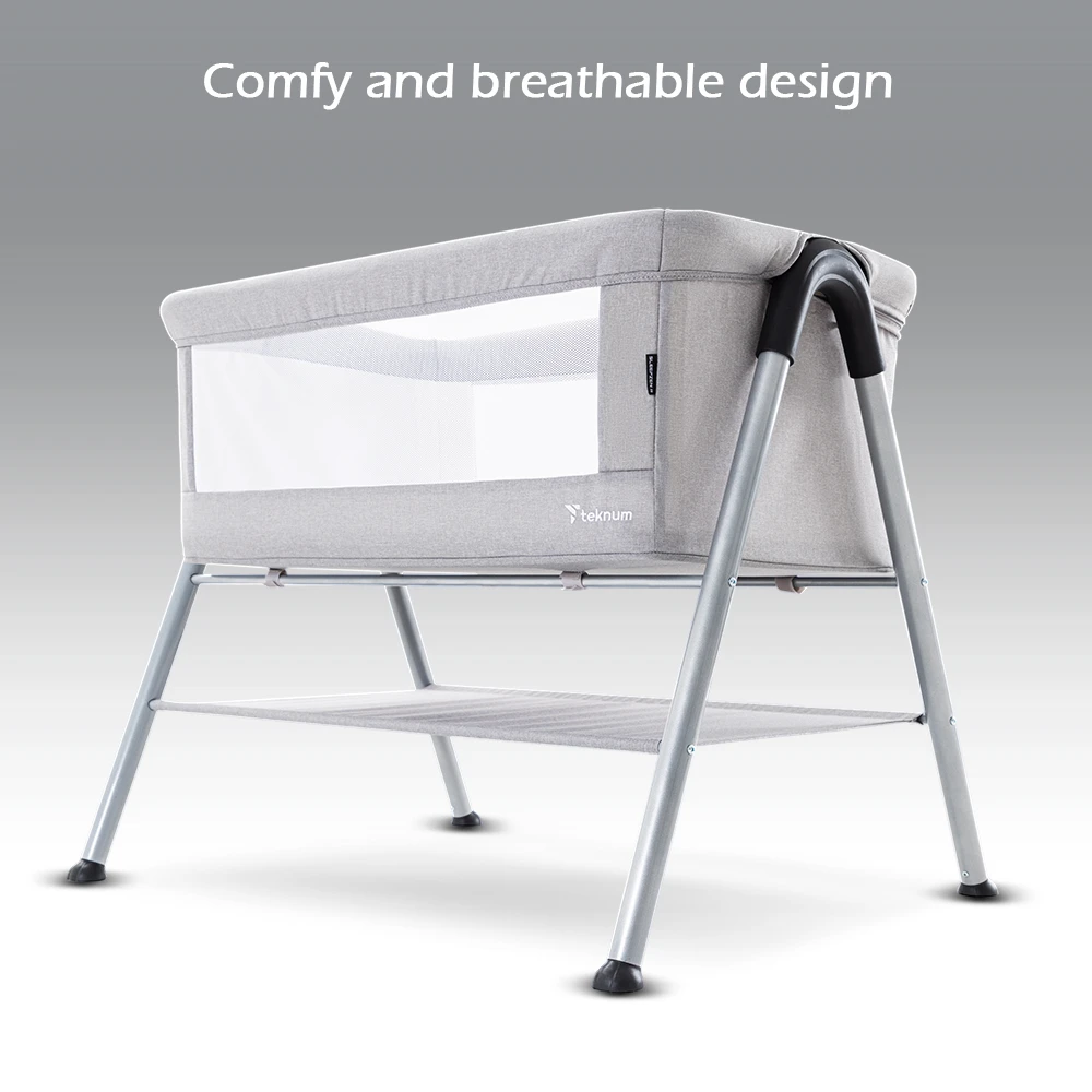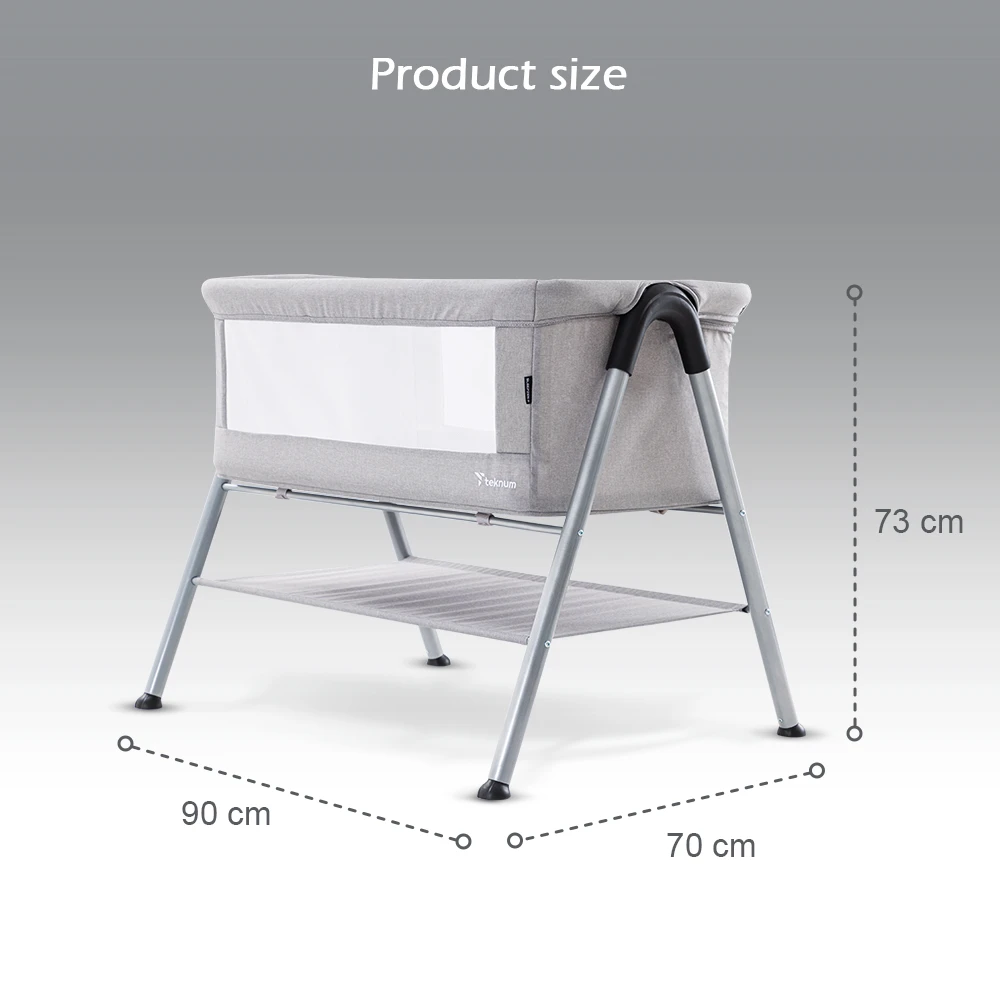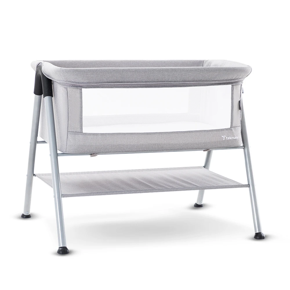 bedside crib, bassinet grey, teknum sleepzen 2, bedside bassinet, breathable fabric, mesh sides, storage basket, steel frame, compatible mattress, easy access crib, nursery furniture, compact bassinet, portable crib, modern design, soft fabric, baby essentials storage, airflow crib, safe sleep, parent proximity, lightweight bassinet