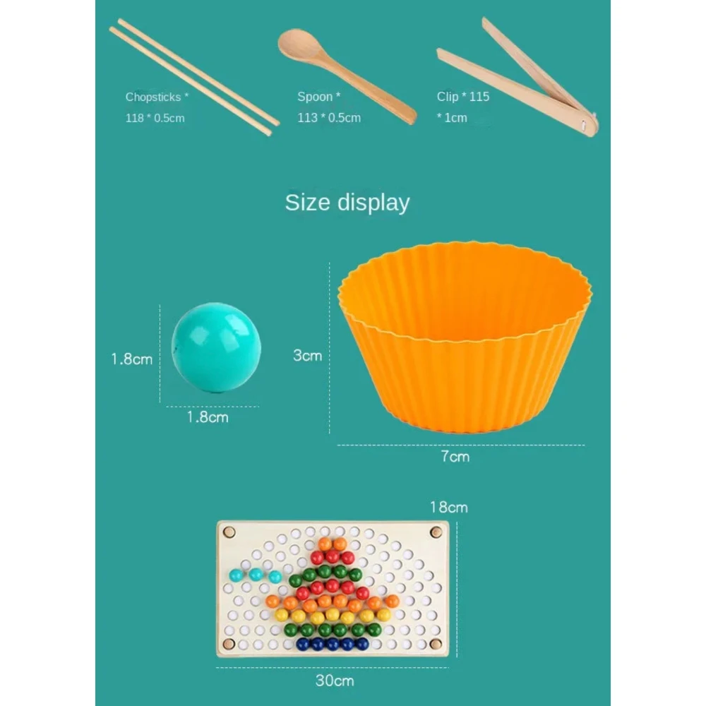 Our Rainbow Clip Beads toy help kids learn colors, shapes, counting, sorting and matching. This will help with their logical thinking skills and early child development. Kids may also look at it as an art project which enhances thei creativity. Comes with 3 different tools to grasp the balls and this will help them exercise hand muscles, hand-eye coordination and grasping skills.